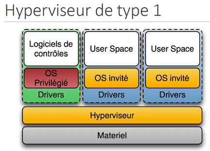 On le nomme l’hyperviseur… et deux concepts de Virtualisation émergent alors, catégorisant les hyperviseurs en type 1 ou type 2.