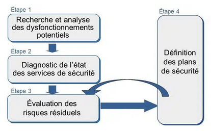 Un autre standard de gestion des risques a également fait son apparition dans la deuxième moitié des années 1990 : MEHARI. Comme Ebios RM, il s’agit d’une méthode de gestion des risques itérative, qui se compose de quatre étapes :